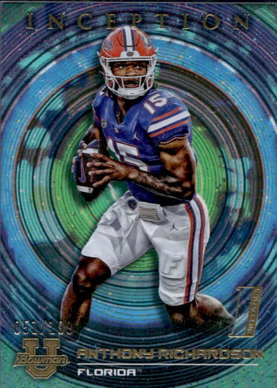 This card is 1 of 17 Anthony Richardson's card variations in the 2022 Bowman University Inception set being tracked by Sports Card Investor, including Base (1st), Green Foil /299 (1st), Blue Foil /99 (1st), Fuchsia Foil /75 (1st), and Gold Foil /50 (1st).