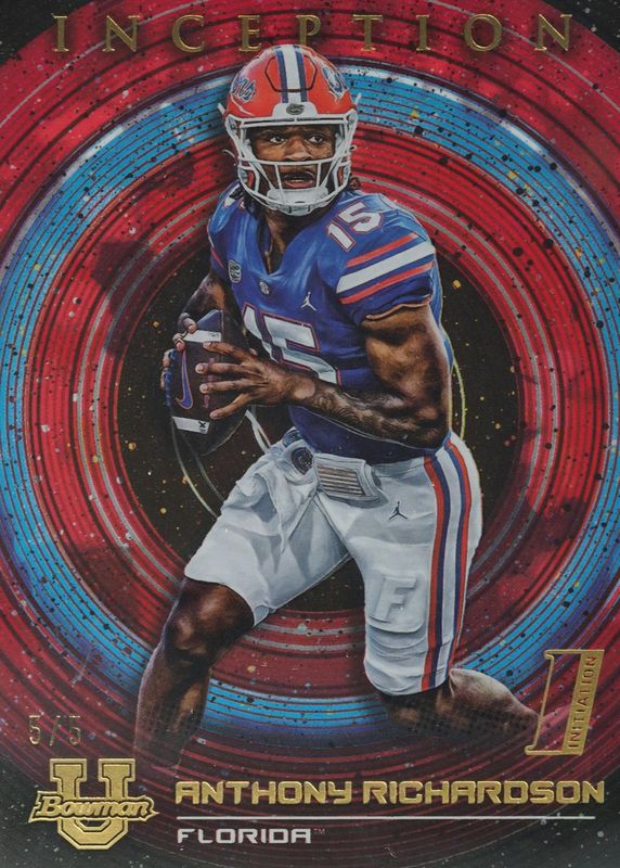 This card is 1 of 17 Anthony Richardson's card variations in the 2022 Bowman University Inception set being tracked by Sports Card Investor, including Base (1st), Green Foil /299 (1st), Aqua Foil /199 (1st), Blue Foil /99 (1st), and Fuchsia Foil /75 (1st).