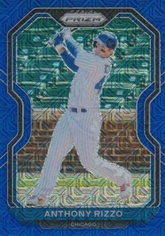 The Anthony Rizzo 2021 Prizm #28 Blue Mojo /199 card is 1 of 47 Anthony Rizzo's card variations in the 2021 Prizm set being tracked by Sports Card Investor, including Base, Blue, Blue Velocity, Carolina Blue, and Cosmic Haze.