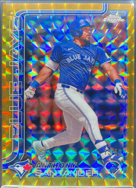 The Anthony Santander 2025 Topps Chrome #60 Gold Geometric Refractor /50 card is 1 of 51 Anthony Santander's card variations in the 2025 Topps Chrome set being tracked by Sports Card Investor, including Base, Geometric Refractor, Lightboard Logo Variation, Negative Refractor, and Prism Refractor.