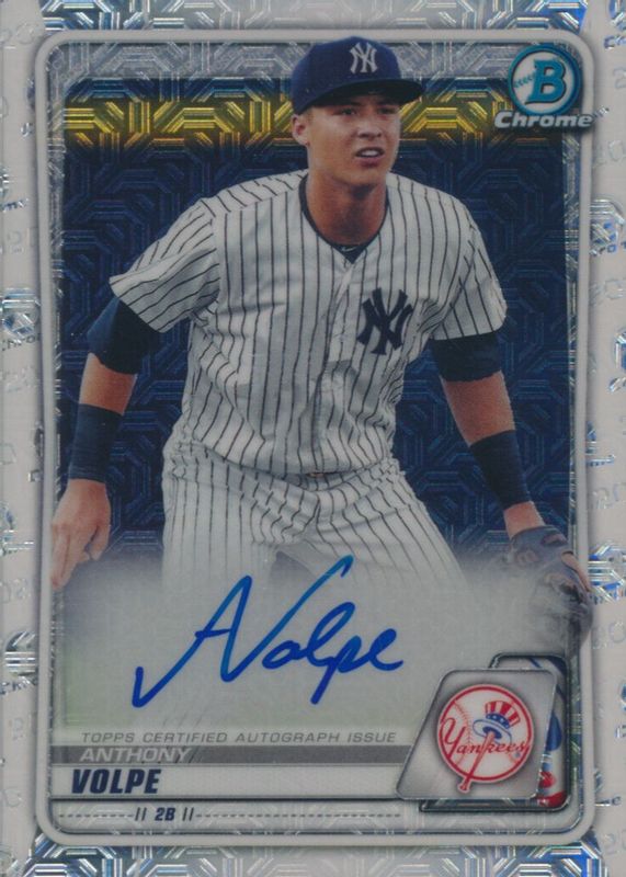 The Anthony Volpe 2020 Bowman Mega Box #BMA-AVO Chrome Prospect Auto - Mojo Refractor card in Raw condition has moved up $21.99 (+84.6%) in the last 30 days and was last sold for $47.99 .