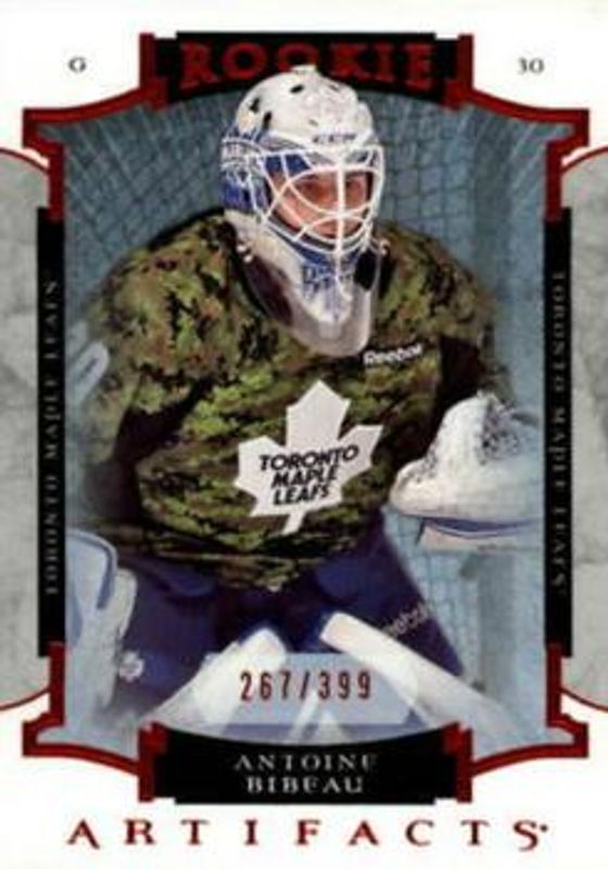 The Antoine Bibeau 2015 Upper Deck Artifacts #162 Ruby /399 Rookie card is 1 of 11 Antoine Bibeau's card variations in the 2015 Upper Deck Artifacts set being tracked by Sports Card Investor, including Base /899, Auto Materials Silver /125, Emerald /99, Sapphire /85, and Material Emerald /49.