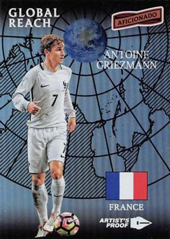 The Antoine Griezmann 2016 Aficionado #168 Artist's Proof card is 1 of 18 Antoine Griezmann's card variations in the 2016 Aficionado set being tracked by Sports Card Investor, including #119 Base, #168 Base, #119 Artist's Proof, #119 First Kick, and #119 Artist's Proof Red /99.