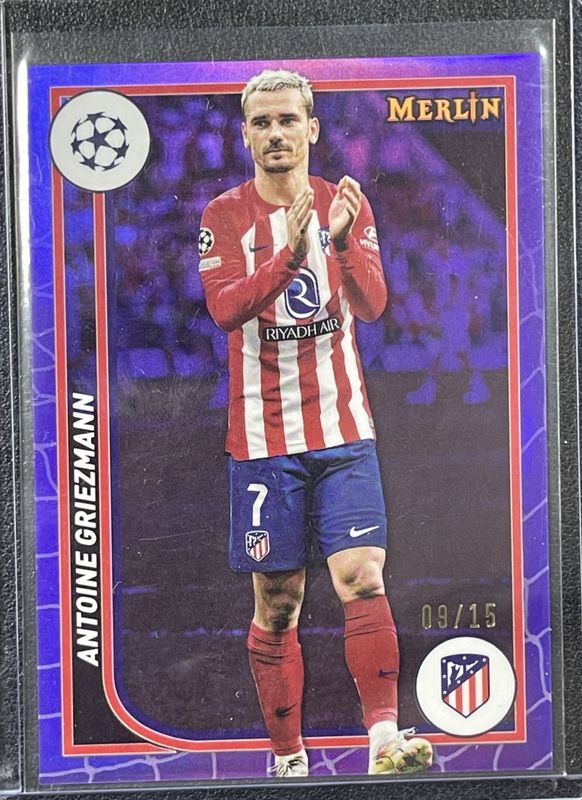 The Antoine Griezmann 2023 Topps Merlin Chrome UEFA Club Competitions #17 Purple Refractor /15 card is 1 of 37 Antoine Griezmann's card variations in the 2023 Topps Merlin Chrome UEFA Club Competitions set being tracked by Sports Card Investor, including Base, Aqua Prism Refractor, Refractor, Vintage Merlin Refractor, and Neon Green Shimmer Refractor /399.