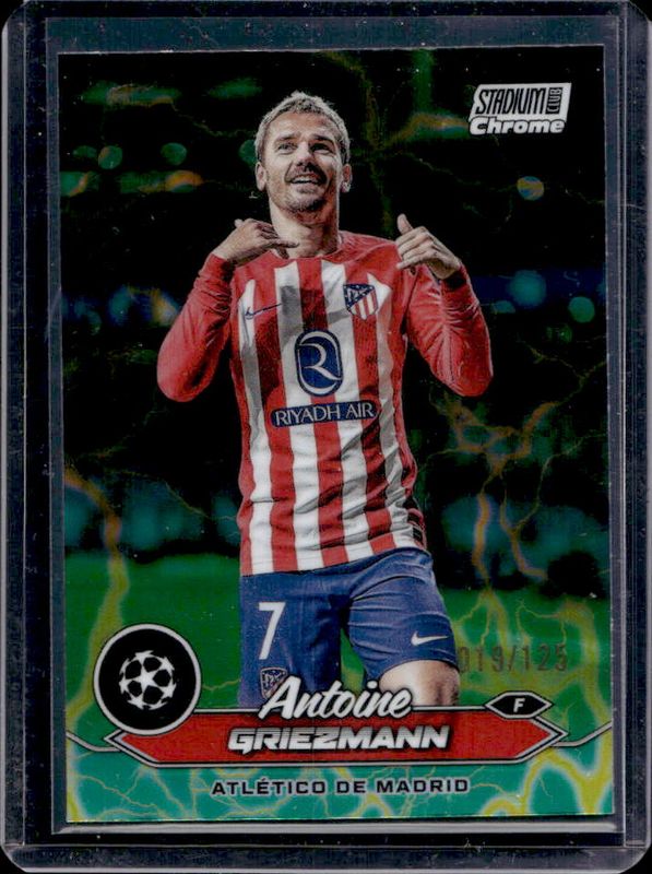 The Antoine Griezmann 2023 Topps Stadium Club Chrome UEFA Champions League #54 Green Yellow Electric Charge /125 card is 1 of 25 Antoine Griezmann's card variations in the 2023 Topps Stadium Club Chrome UEFA Champions League set being tracked by Sports Card Investor, including Base, Members Only Refractor, Pink Red Electric Charge Refractor, Refractor, and Black & White Refractor /299.