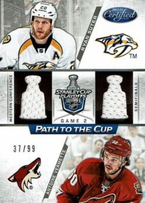 The Antoine Vermette / Ryan Suter 2012 Certified #PCSF6 Path to the Cup Semifinals Dual Jerseys /99 card is 1 of 3 Antoine Vermette / Ryan Suter's card variations in the 2012 Certified set being tracked by Sports Card Investor, including Path to the Cup Semifinals /299, and Path to the Cup Semifinals Dual Jerseys Prime /10.