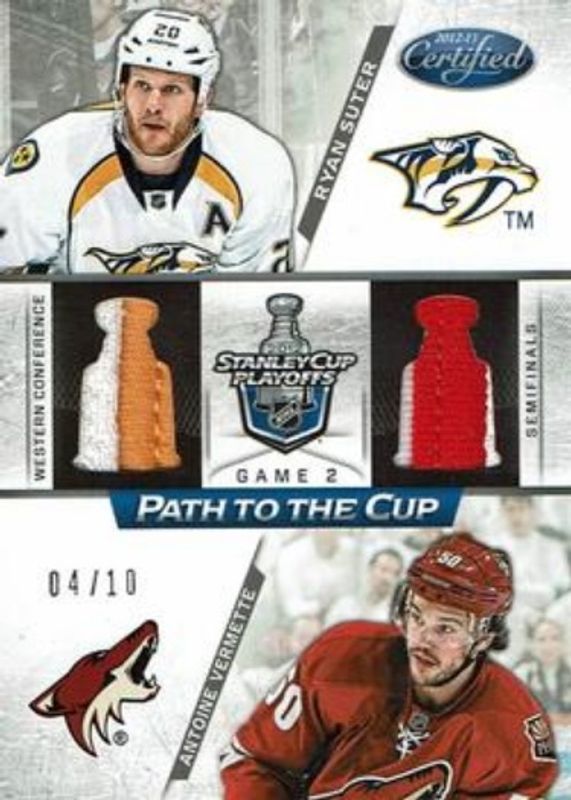 The Antoine Vermette / Ryan Suter 2012 Certified #PCSF6 Path to the Cup Semifinals Dual Jerseys Prime /10 card is 1 of 3 Antoine Vermette / Ryan Suter's card variations in the 2012 Certified set being tracked by Sports Card Investor, including Path to the Cup Semifinals /299, and Path to the Cup Semifinals Dual Jerseys /99.