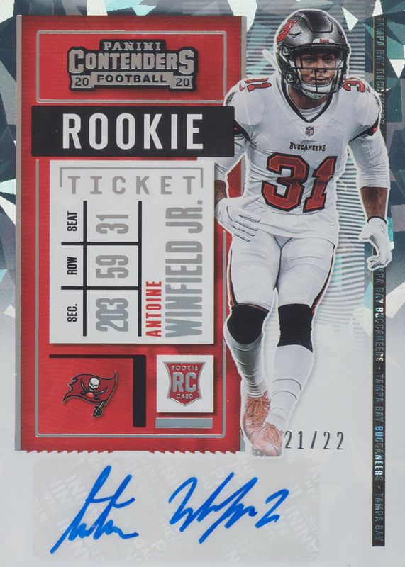 This card is 1 of 8 Antoine Winfield Jr.'s card variations in the 2020 Contenders set being tracked by Sports Card Investor, including Rookie Ticket Auto, Rookie Ticket Auto - Red Zone Ticket, Rookie Ticket Auto - Ticket Stub (/31), Rookie Ticket Auto - Playoff Ticket /99, and Rookie Ticket Auto - Wild Card /(SSP).
