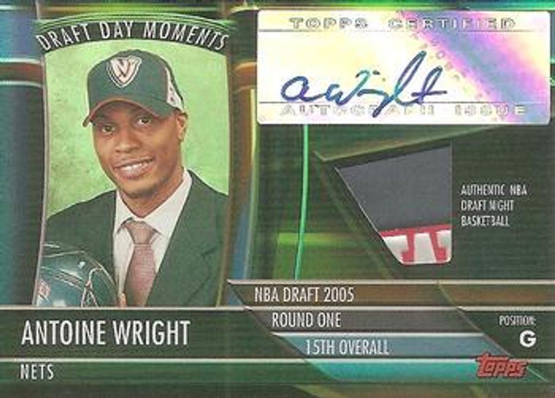 The Antoine Wright 2005 Topps Big Game #DDBA-AW Draft Day Moments Relics Autographs Basketballs /99 Rookie card is 1 of 12 Antoine Wright's card variations in the 2005 Topps Big Game set being tracked by Sports Card Investor, including Base /179, Red /99, Blue /33, Gold /1, and Draft Day Moments Relics Autographs Hats /129.