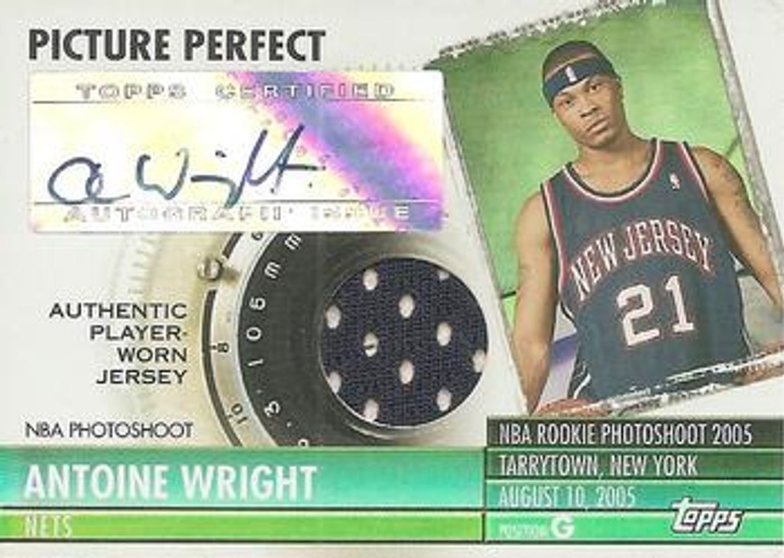 The Antoine Wright 2005 Topps Big Game #PPA-AW Picture Perfect Relics Autographs /129 Rookie card is 1 of 12 Antoine Wright's card variations in the 2005 Topps Big Game set being tracked by Sports Card Investor, including Base /179, Red /99, Blue /33, Gold /1, and Draft Day Moments Relics Autographs Hats /129.