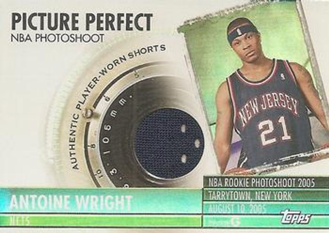 The Antoine Wright 2005 Topps Big Game #PPRS-AW Picture Perfect Relics /129 Rookie card is 1 of 12 Antoine Wright's card variations in the 2005 Topps Big Game set being tracked by Sports Card Investor, including Base /179, Red /99, Blue /33, Gold /1, and Draft Day Moments Relics Autographs Hats /129.