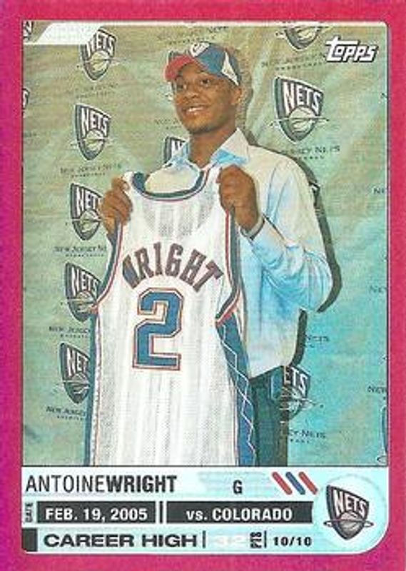 The Antoine Wright 2005 Topps Big Game #123 Red /99 Rookie card is 1 of 12 Antoine Wright's card variations in the 2005 Topps Big Game set being tracked by Sports Card Investor, including Base /179, Blue /33, Gold /1, Draft Day Moments Relics Autographs Hats /129, and Picture Perfect Relics /129.