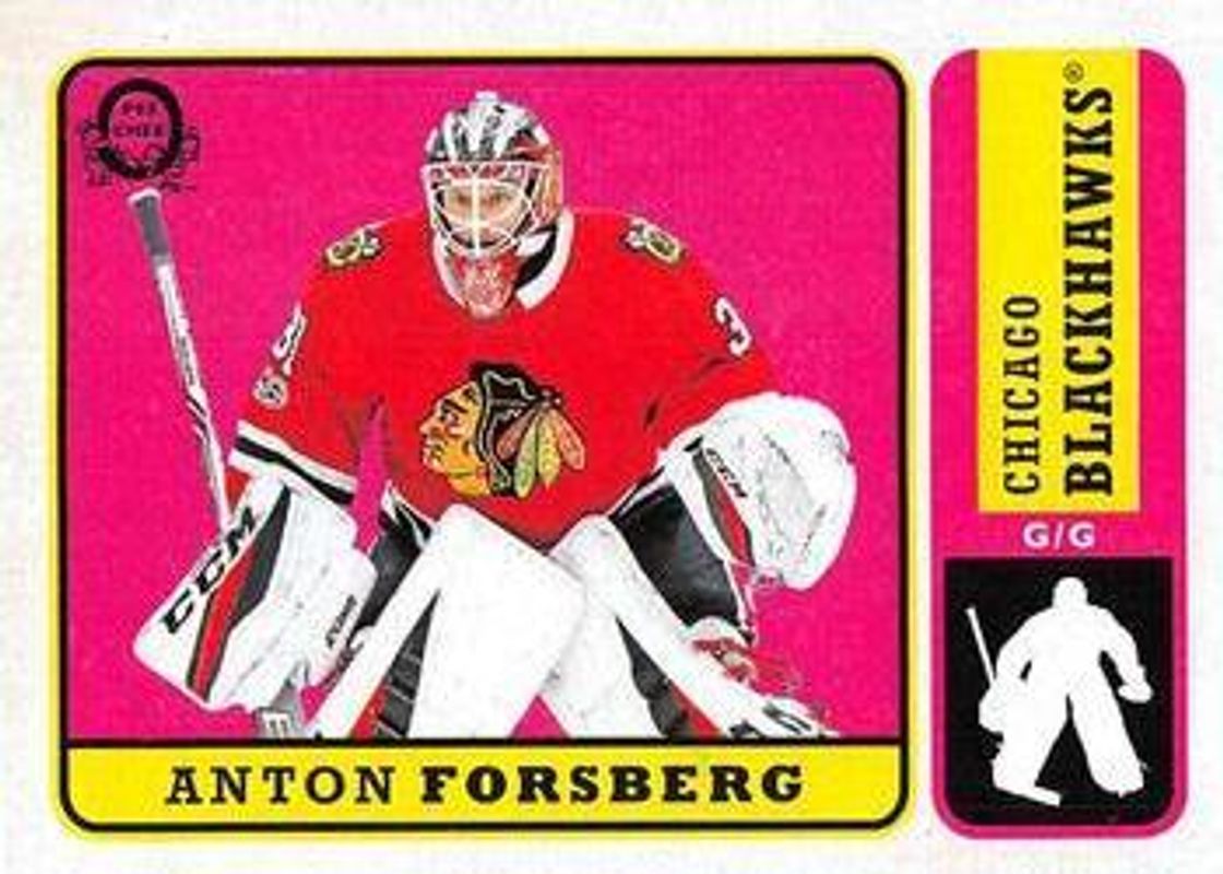 The Anton Forsberg 2018 O-Pee-Chee #147 Retro Blank Back card is 1 of 9 Anton Forsberg's card variations in the 2018 O-Pee-Chee set being tracked by Sports Card Investor, including Base, Gold Border Glossy, Retro, Retro No Name Scratch Off, and Silver.
