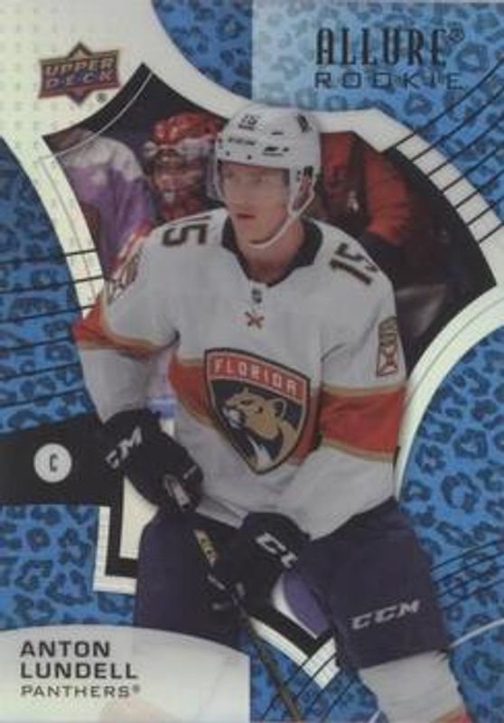 The Anton Lundell 2021 Upper Deck Allure #105 Pink Blue Leopard Rookie card is 1 of 26 Anton Lundell's card variations in the 2021 Upper Deck Allure set being tracked by Sports Card Investor, including Base, 1917 Shield, 2005 Shield, Black Rainbow, and Blue China.