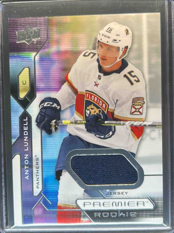 The Anton Lundell 2021 Upper Deck Premier #147 Jersey Rookie card is 1 of 37 Anton Lundell's card variations in the 2021 Upper Deck Premier set being tracked by Sports Card Investor, including Base /399, Gold /199, Bronze /65, Purple /10, and Platinum /1.