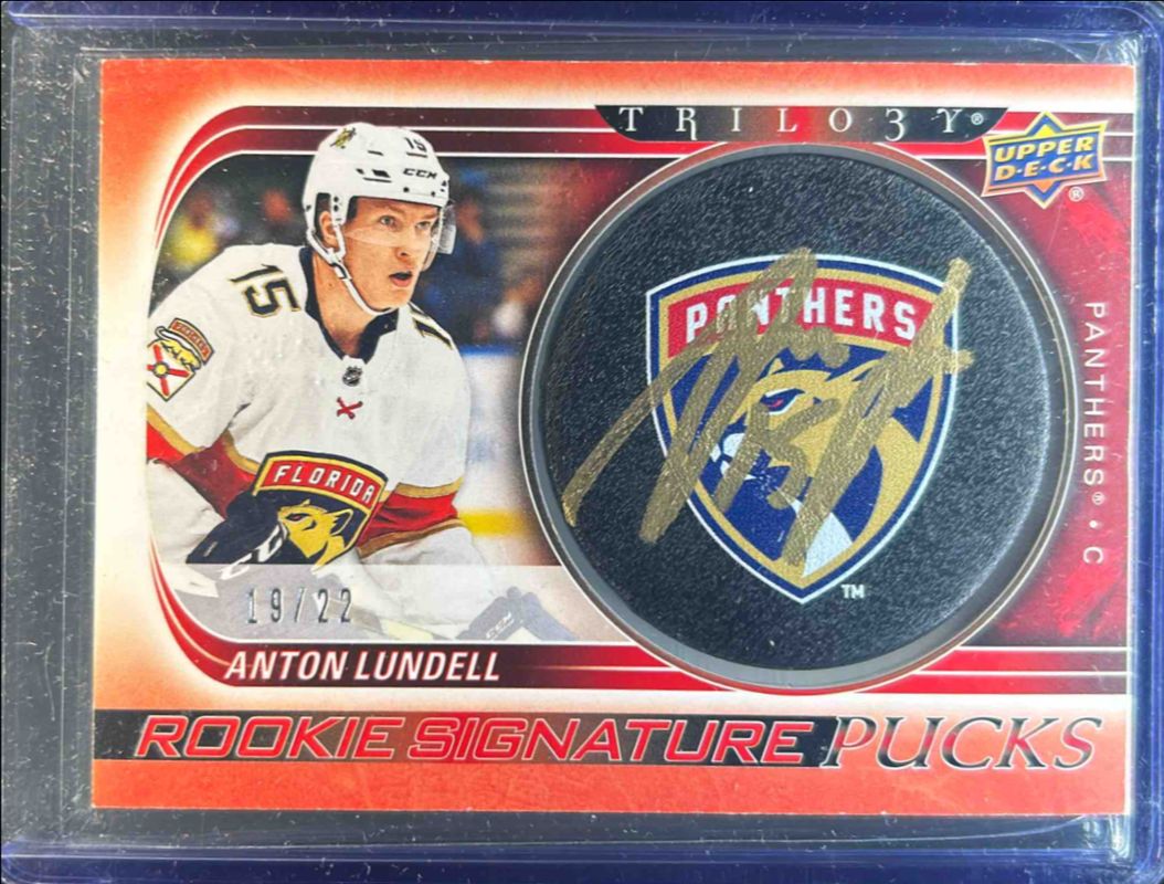 The Anton Lundell 2022 Upper Deck Trilogy #21-SP-AL 2020 Upper Deck Trilogy Update: Rookie Signatures Pucks Team Logo /22 card is 1 of 13 Anton Lundell's card variations in the 2022 Upper Deck Trilogy set being tracked by Sports Card Investor, including 2020 Upper Deck Trilogy Update: Rookie Signatures Pucks, Generations, Generations - Red /699, Generations - Blue /299, and Generations Mem - Jersey /99.