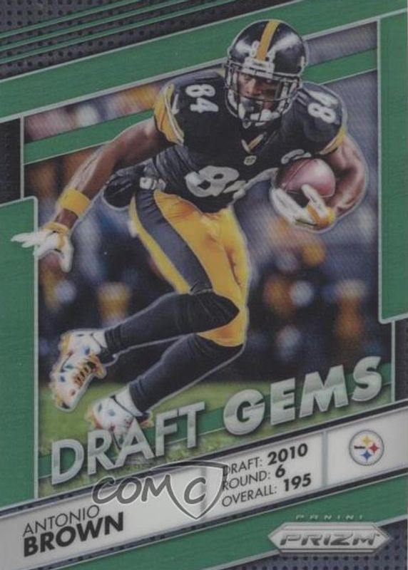 The Antonio Brown 2016 Prizm #17 Draft Gems - Green card in Raw condition has not changed in price in the last 30 days and was last sold for $4.99 .