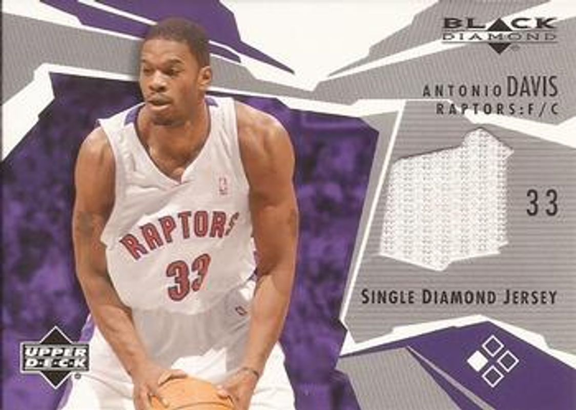 The Antonio Davis 2003 Upper Deck Black Diamond #BD-AD Single Diamond Jersey card is 1 of 6 Antonio Davis' card variations in the 2003 Upper Deck Black Diamond set being tracked by Sports Card Investor, including Base, Bronze /100, Gold /25, Rainbow /10, and Single Diamond Jersey Gold /100.
