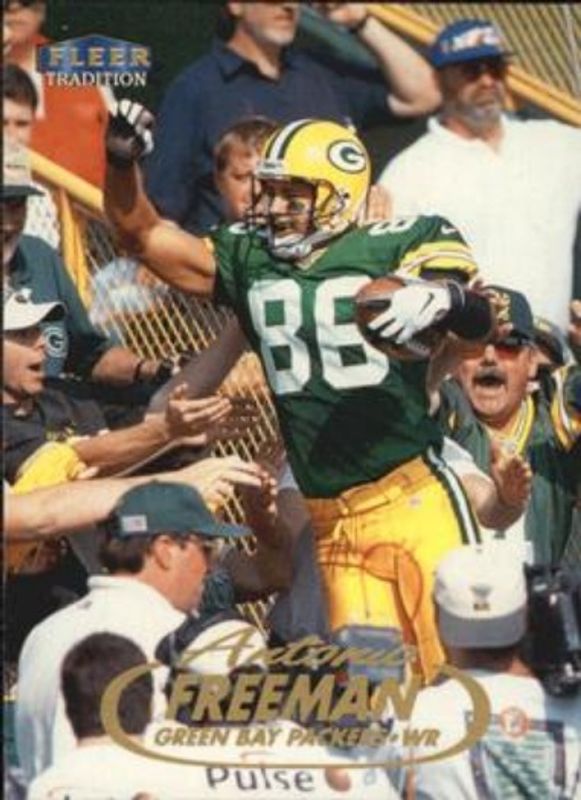 The Antonio Freeman 1998 Fleer Tradition #218 Base card is 1 of 3 Antonio Freeman's card variations in the 1998 Fleer Tradition set being tracked by Sports Card Investor, including Heritage /125, and Playmakers Theatre /100.