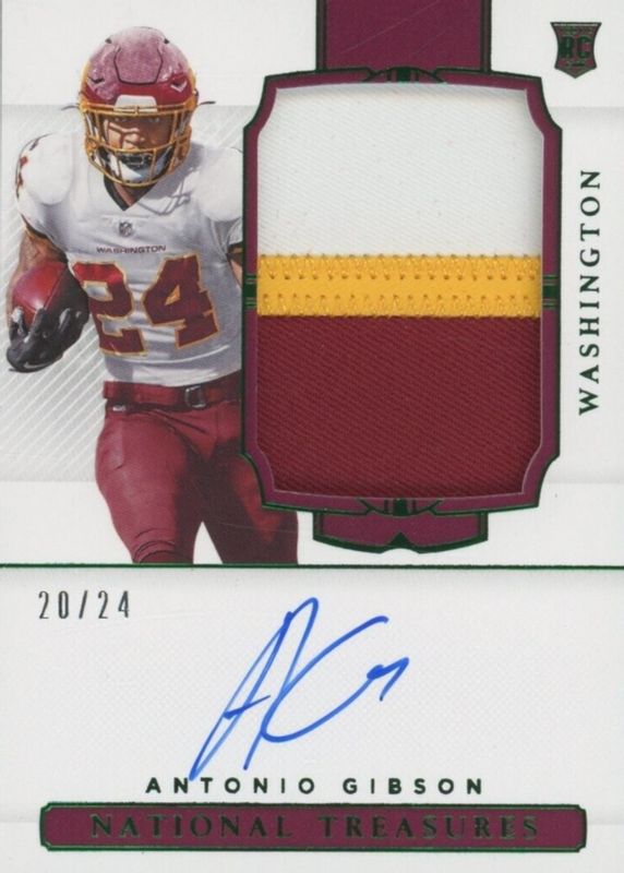 The Antonio Gibson 2020 National Treasures #185 Rookie Patch Auto - Green Jersey Number (/24) card in Raw condition has not changed in price in the last 30 days and was last sold for $10.25 .
