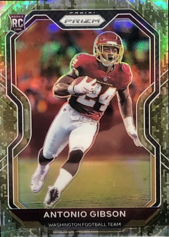The Antonio Gibson 2020 Prizm #384 Camo /25 Rookie card in Raw condition has not changed in price in the last 30 days and was last sold for $6.00 .