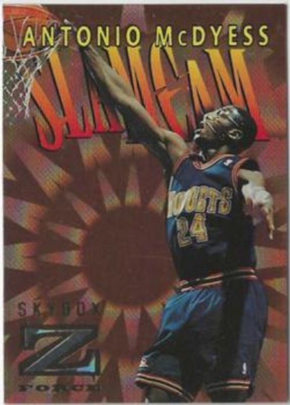 The Antonio McDyess 1996 Skybox Z-Force #SC8 Slam Cam card is 1 of 7 Antonio McDyess' card variations in the 1996 Skybox Z-Force set being tracked by Sports Card Investor, including #183 Base, #23 Base, #23 Z Cling, #SC8 Slam Cam, and Autographics Black Ink.