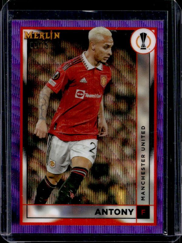 The Antony 2022 Topps Merlin Chrome UEFA Club Competitions #102 Purple Wave Refractor /15 card is 1 of 36 Antony's card variations in the 2022 Topps Merlin Chrome UEFA Club Competitions set being tracked by Sports Card Investor, including Base, Refractor, Vintage Merlin Refractor, Neon Green Shimmer Refractor /350, and Pink Mojo Refractor /275.