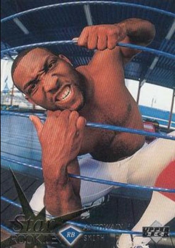 The Antowain Smith 1997 Upper Deck #16 Base Rookie card is 1 of 3 Antowain Smith's card variations in the 1997 Upper Deck set being tracked by Sports Card Investor, including Star Attractions, and Star Attractions Gold.