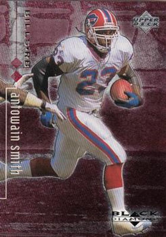 The Antowain Smith 1998 Upper Deck Black Diamond Rookie Edition #11 Double /2500 card is 1 of 6 Antowain Smith's card variations in the 1998 Upper Deck Black Diamond Rookie Edition set being tracked by Sports Card Investor, including Base, Triple /1000, Quadruple /100, Sheer Brilliance /1300, and Extreme Brilliance /13.