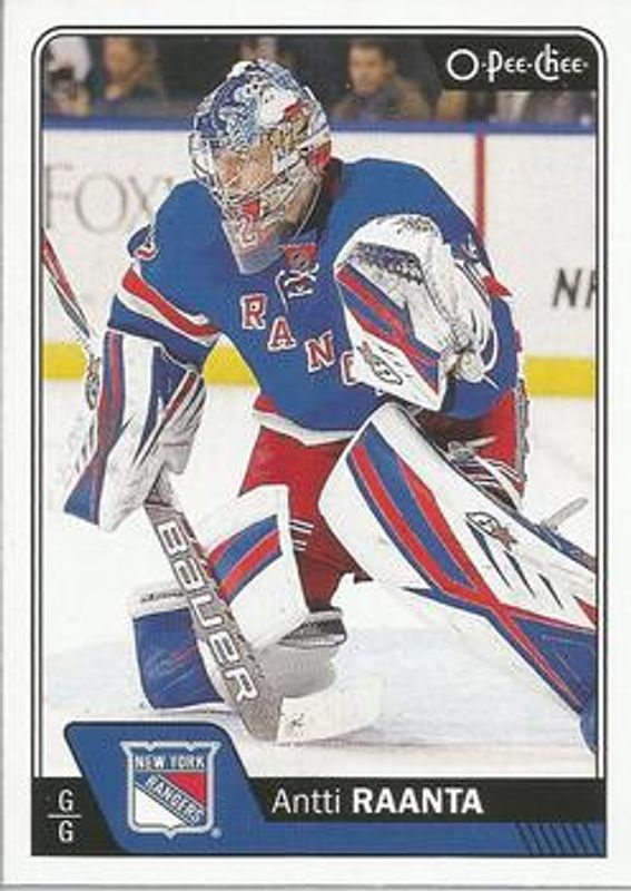 The Antti Raanta 2016 O-Pee-Chee #197 Base card is 1 of 6 Antti Raanta's card variations in the 2016 O-Pee-Chee set being tracked by Sports Card Investor, including Rainbow Foil, Retro, Retro Blank Back, Black Rainbow Foil /100, and Red Border.