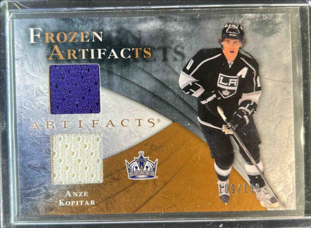 The Anze Kopitar 2010 Upper Deck Artifacts #FA-AK Frozen Artifacts /150 card is 1 of 39 Anze Kopitar's card variations in the 2010 Upper Deck Artifacts set being tracked by Sports Card Investor, including #44 Base /699, #180 Base /699, #44 Emerald /50, #180 Emerald /50, and #44 Gold /35.