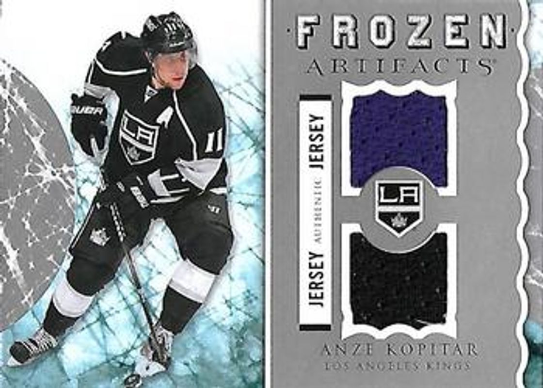 The Anze Kopitar 2012 Upper Deck Artifacts #FA-AK Frozen Artifacts Jerseys Blue card is 1 of 20 Anze Kopitar's card variations in the 2012 Upper Deck Artifacts set being tracked by Sports Card Investor, including Base /699, Emerald /99, Sapphire /85, Gold Spectrum /25, and Black /5.