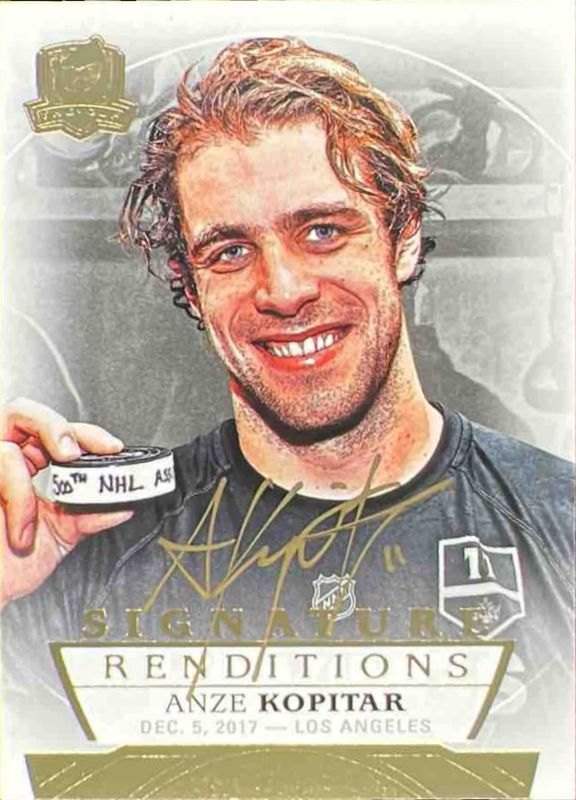 The Anze Kopitar 2018 Upper Deck The Cup #SR-AK 2017 Upper Deck The Cup Update I: Signatures Renditions card is 1 of 19 Anze Kopitar's card variations in the 2018 Upper Deck The Cup set being tracked by Sports Card Investor, including #SP2-BT 2017 Upper Deck The Cup Update I /99, #09T-AK 2017 Upper Deck The Cup Update I /99, #39 2017 Upper Deck The Cup Update I /99, #MP-AK 2017 Upper Deck The Cup Update I /99, and #ER-AK 2017 Upper Deck The Cup Update I: Exquisite Collection Endorsements Autographs - Relics /25.