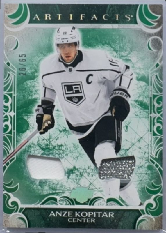 The Anze Kopitar 2024 Upper Deck Artifacts #38 Material - Emerald /35 card is 1 of 23 Anze Kopitar's card variations in the 2024 Upper Deck Artifacts set being tracked by Sports Card Investor, including Neon Green, Silver /699, Ruby /399, Emerald /149, and Copper /99.