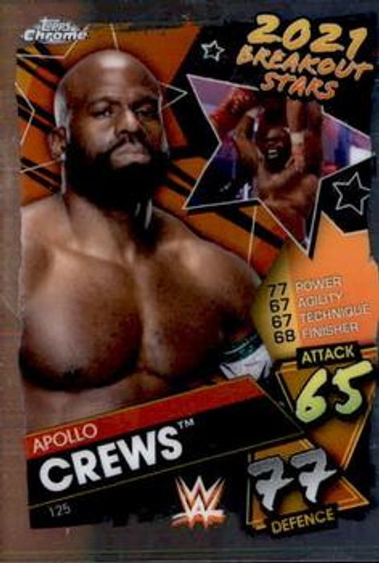 The Apollo Crews 2021 Topps Chrome Slam Attax WWE #125 Base card is 1 of 27 Apollo Crews' card variations in the 2021 Topps Chrome Slam Attax WWE set being tracked by Sports Card Investor, including #144 Base, #8 Base, #125 Refractor, #144 Refractor, and #8 Refractor.