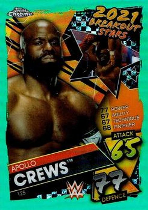 The Apollo Crews 2021 Topps Chrome Slam Attax WWE #125 Green Refractor /50 card is 1 of 27 Apollo Crews' card variations in the 2021 Topps Chrome Slam Attax WWE set being tracked by Sports Card Investor, including #125 Base, #144 Base, #8 Base, #125 Refractor, and #144 Refractor.