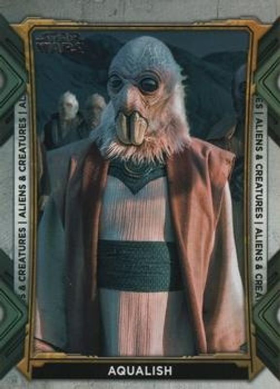 The Aqualish 2022 Topps Star Wars The Book of Boba Fett #AC-9 Aliens & Creatures card is 1 of 6 Aqualish's card variations in the 2022 Topps Star Wars The Book of Boba Fett set being tracked by Sports Card Investor, including Aliens & Creatures Red /99, Aliens & Creatures Bronze /50, Aliens & Creatures Silver /25, Aliens & Creatures Gold /10, and Aliens & Creatures Black /1.
