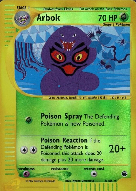 The Arbok 2002 Expedition #003/165 Reverse Holo card in Raw TCG (Near Mint) condition has not changed in price in the last 30 days and was last sold for $18.95 .