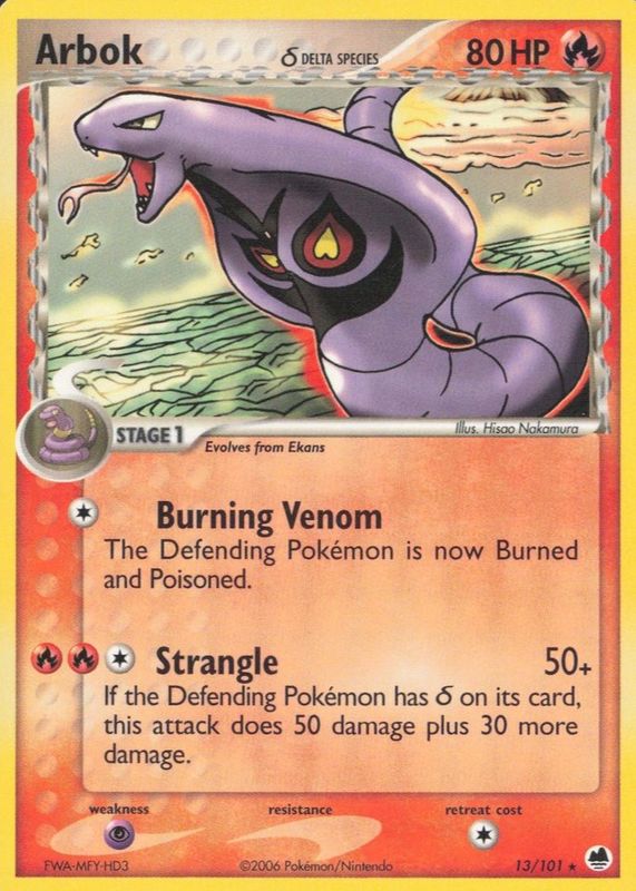 The Arbok 2006 EX: Dragon Frontiers #013/101 Base card in Raw TCG (Lightly Played) condition has moved down -$17.00 (-85.0%) in the last 30 days and was last sold for $2.99 .