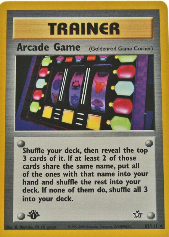The Arcade Game 2000 Neo Genesis #83/111 1st Edition card in Raw TCG (Near Mint) condition has moved down -$2.00 (-20.0%) in the last 30 days and was last sold for $7.99 .