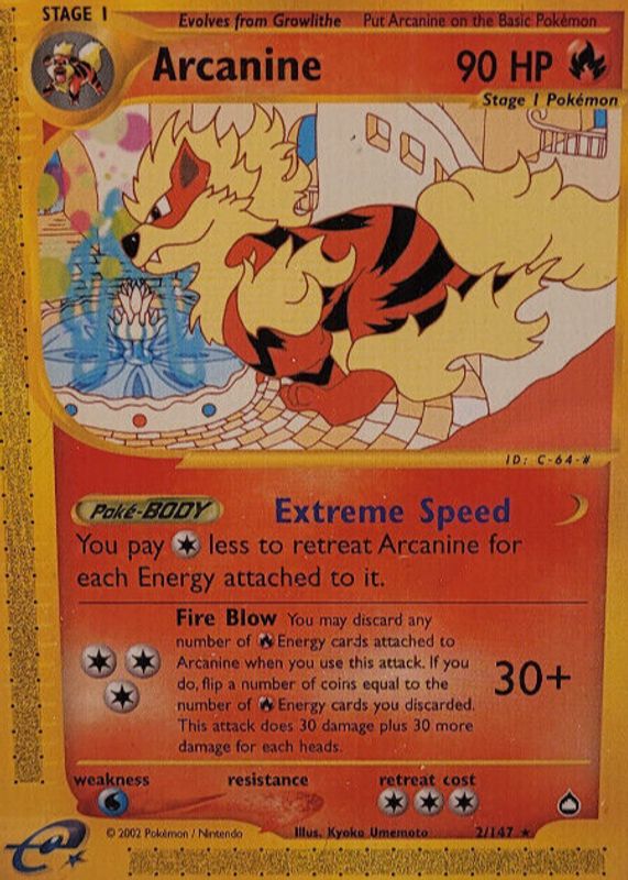 The Arcanine 2003 Aquapolis #002/147 Base card in Raw TCG (Near Mint) condition has not changed in price in the last 30 days and was last sold for $57.06 .