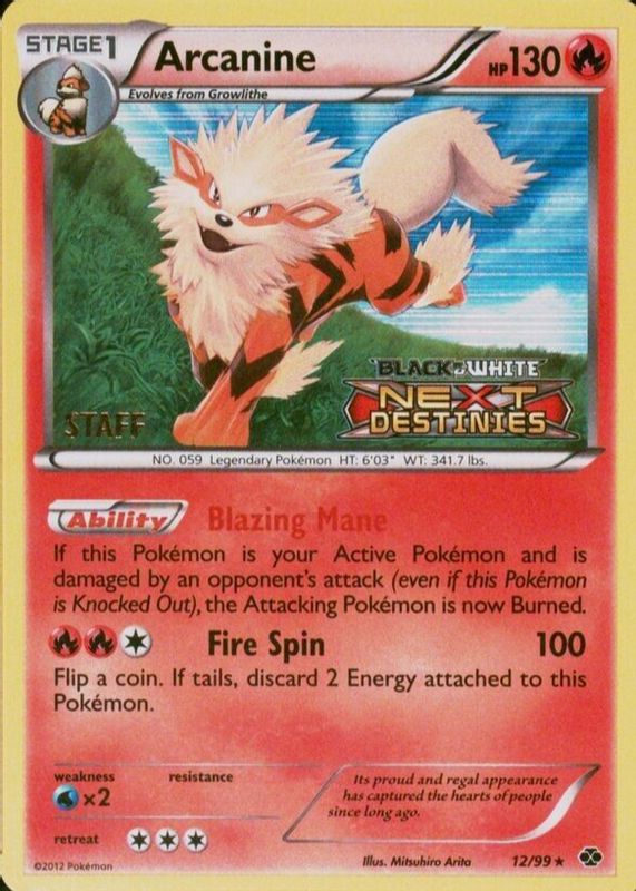 Arcanine 2012 Black & White: Next Destinies #12/99 Promo (Prerelease - STAFF) RAW TCG (NEAR MINT) Price Guide