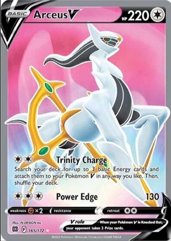 The Arceus V 2022 Sword & Shield: Brilliant Stars #165/172 Holo (Full Art) card in Raw TCG (Near Mint) condition has moved up $3.35 (+59.0%) in the last 30 days and was last sold for $9.05 .