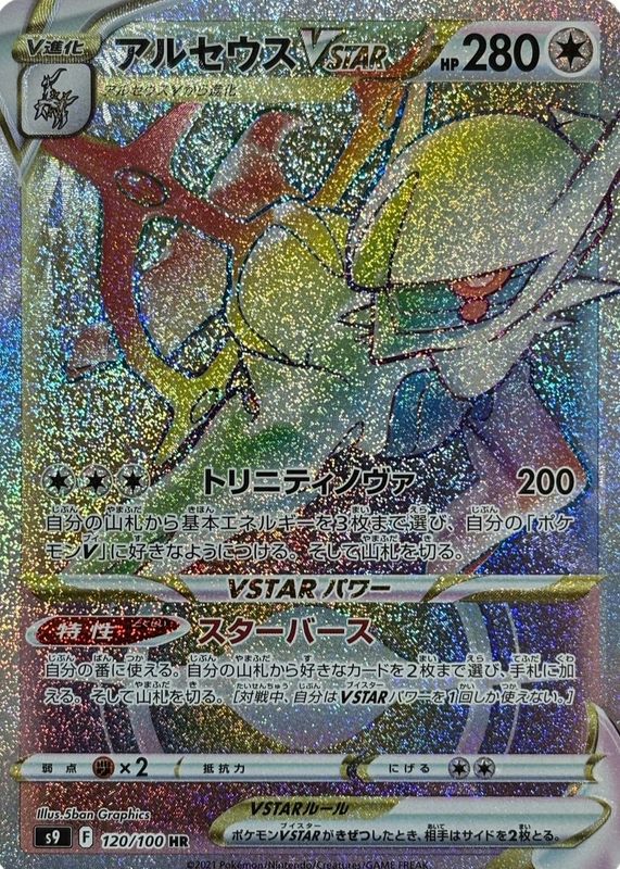 The Arceus VSTAR 2022 Japanese Sword & Shield: Star Birth #120/100 Hyper Rare card in Raw TCG (Near Mint) condition has not changed in price in the last 30 days and was last sold for $12.00 .