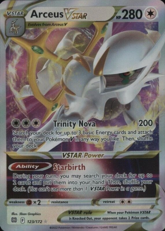 The Arceus VSTAR 2022 Sword & Shield: Brilliant Stars #123/172 Holo card in Raw TCG (Near Mint) condition has moved up $2.06 (+41.3%) in the last 30 days and was last sold for $7.06 .