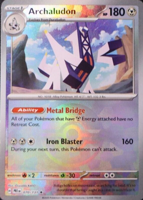 The Archaludon 2025 Scarlet & Violet: Prismatic Evolutions #070/131 Poke Ball Reverse Holo card in Raw TCG (Lightly Played) condition has not changed in price in the last 30 days and was last sold for $0.99 .