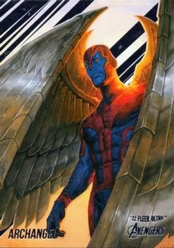 The Archangel 2022 Fleer Ultra Avengers #2 Base card is 1 of 15 Archangel's card variations in the 2022 Fleer Ultra Avengers set being tracked by Sports Card Investor, including Gold Rainbow Foil, Green Foil, Rainbow Foil, Orange Foil /549, and Blue Foil /360.