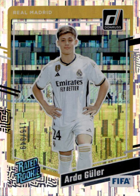 The Arda Guler 2023 Donruss #184 Silver Rookie card is 1 of 44 Arda Guler's card variations in the 2023 Donruss set being tracked by Sports Card Investor, including Base, Optic, Cubic, Diamond, and Optic - Argyle.