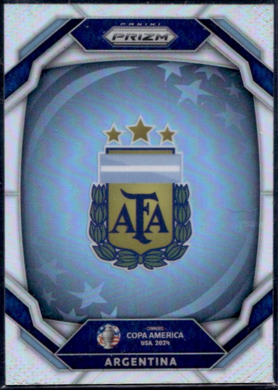 The Argentina 2024 Prizm Copa America #1 Team Badges - Silver card is 1 of 5 Argentina's card variations in the 2024 Prizm Copa America set being tracked by Sports Card Investor, including Team Badges, Team Badges - Orange /25, Team Badges - Gold /10, and Team Badges - Black /1.