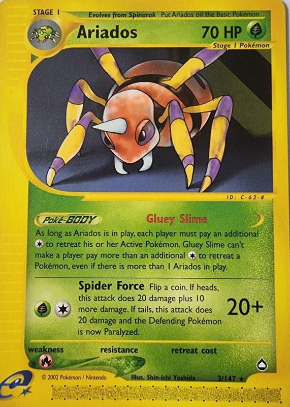 The Ariados 2003 Aquapolis #003/147 Base card in Raw TCG (Near Mint) condition has moved up $8.67 (+183%) in the last 30 days and was last sold for $13.41 .